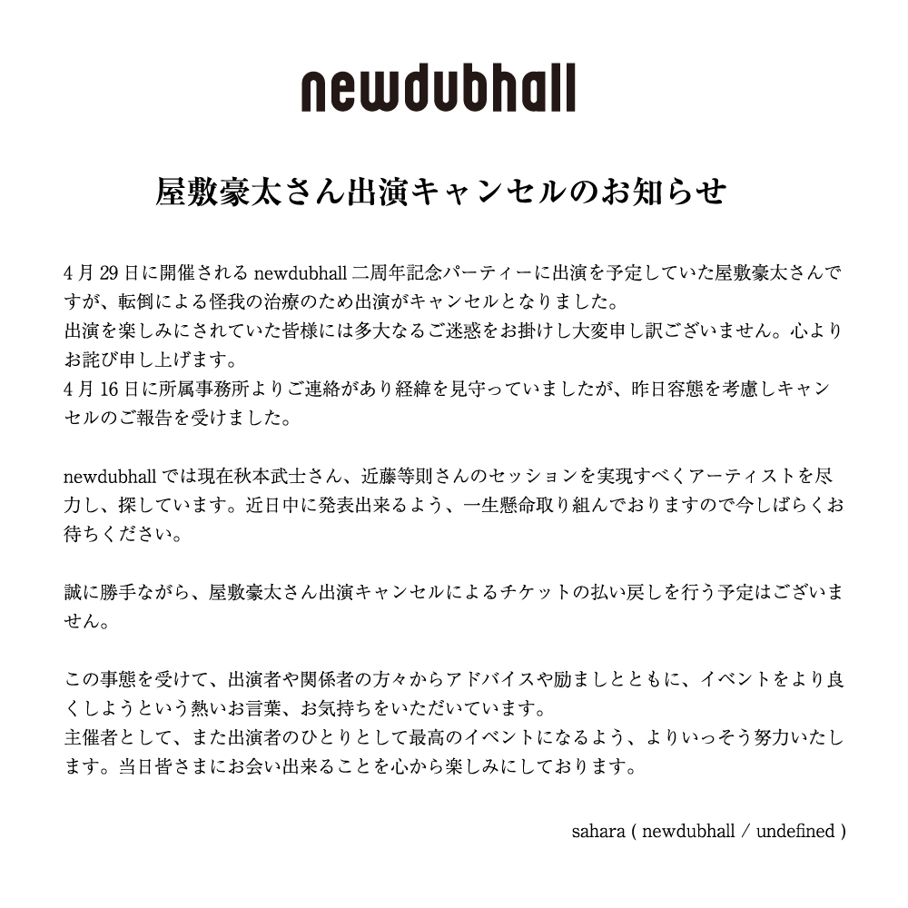 レゲエはもちろんのこと、ポップ・ミュージックの細部や、ポストロック、テクノやベース・ミュージック、レフトフィールドな電子音響までその英知はある意味で、現代流通している音楽のほとんどに潜んでいると言えるだろう。newdubhallは、まさにそんな“ダブ”のオーセンティックと最前衛を結ぶ交点として存在するレーベルだ。本イベントはそんなnewdubhallの2ndアニヴァーサルであり、まさにそんな交点を現場の、そこにある空気として代官山UNITのフロアへと充満させるだろう。